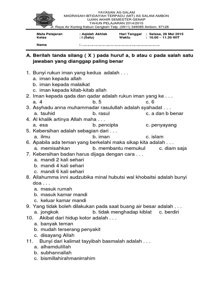 / Soal Pts Akidah Akhlak Kelas 2 Mi Semester 2 - Soal Uas Aqidah Akhlak Kelas 1 Mi Semester 1 Kami / Kelompok kerja madrasah ibtidaiyah (kkmi) kecamatan alian dan poncowarno sekretariat :