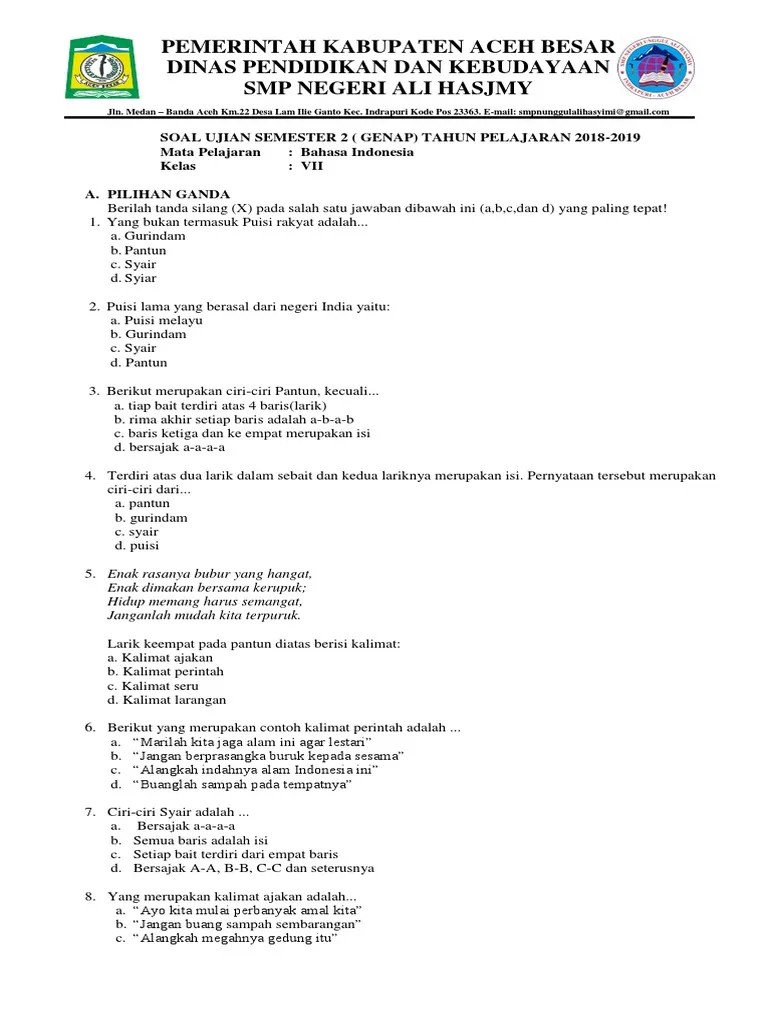 Bagi kalian yang ingin mengetahui juga soal soal pilihan ganda kelas 7 bisa klik link di bawah ini. 1 contoh soal pilihan ganda pg ulangan harian materi puisi kelas 8 revisi terbaru bag. Pengertian puisi dan unsur pembentuk puisi. Contoh soal teks puisi musikalisasi puisi kelas viii 17 nov 2017 1. Pelitaku guruku ilmu yang engkau berikan laksana pelita yang tak pernah padam menerangi jalan gulita Contoh soal jawaban bahasa indonesia kelas 8 smp semester 2. Teks pengumuman ini menajadi salah satu dari functional text bahasa inggris yang harus dipelajari di bangku sekolah menengah di indonesia. Home soal puisi ulangan harian kelas 8 contoh soal materi puisi kelas 8 contoh soal materi puisi kelas 8. Cermatilah teks berikut untuk mengerjakan soal nomor 8 dan 9! Contoh soal pilihan ganda pg ulangan harian materi puisi kelas 8 revisi terbaru bag. Soal soal bahasa indonesia tentang puisi beserta j. Soal uraian teks puisi kls 8.kumpulan soal kelas 8 smt 1. Soal bahasa indonesia kelas 8 smp mts pg dan essay 2020.