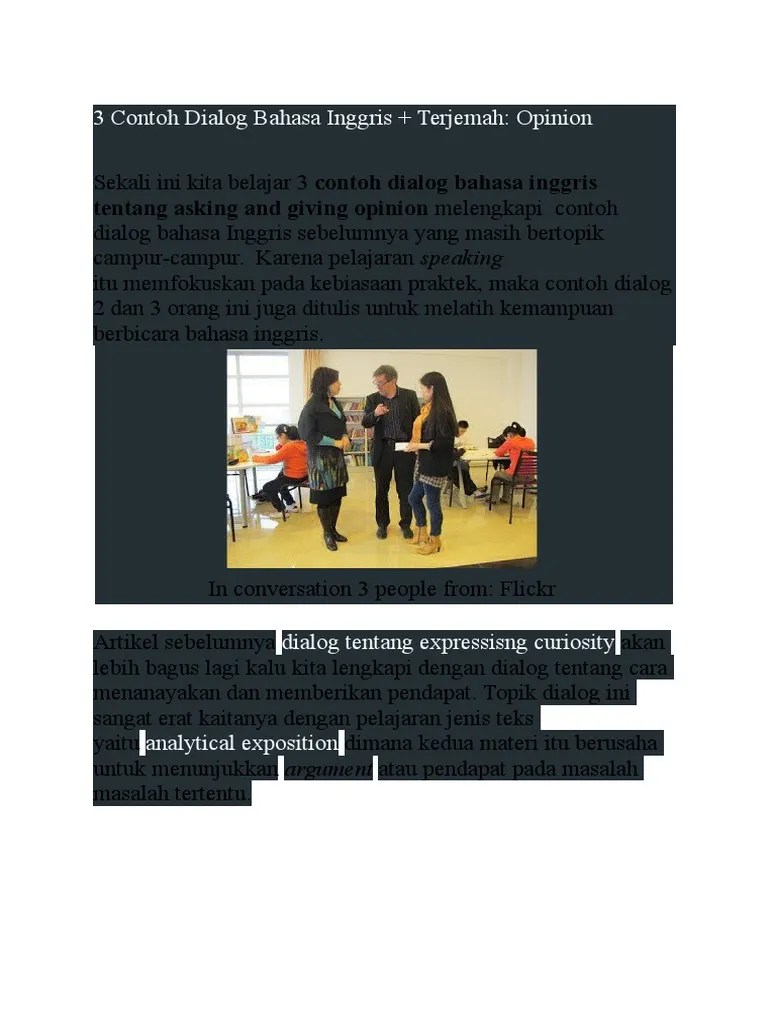 (hani, aku ingin bertanya sesuatu . Contoh dialog expressing opinion (mengutarakan opini) dalam bahasa inggris. Contoh dialog percakapan asking and giving opinion 2, 3, 4,. Percakapan singkat tentang giving opinion atau cara berbicara bahasa inggris tentang memberikan pendapat ini adalah lanjutan dari artikel mengenahi ungkapan . I think there is no difficult lesson.