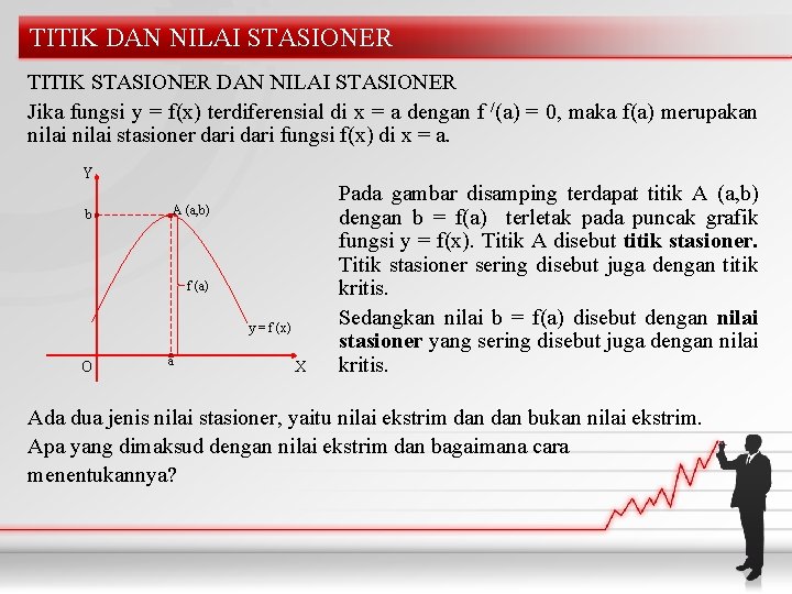 Konsep nilai stasioner fungsi yang telah anda pelajari tersebut merupakan hal khusus dari hal umum berikut. Akan maksimum jika , sehingga. Menentukan interval x pada fungsi naik dan fungsi turun menggunakan turunan fungsi kali ini kita akan membahas tentang materi aplikasi atau penerapan turunan dalam menentukan interval suatu grafik fungsi dalam keadaan naik atau turun. Turunan fungsi biasa digunakan saat menentukan gradien garis singgung suatu kurva menentukan dimana interval naik turun fungsi menentukan jenis nilai stasioner dan beberapa aplikasi pada persamaan gerak atau masalah terkait maksimum dan minimum. contoh soal persamaan schrodinger dan penyelesaiannya 1.